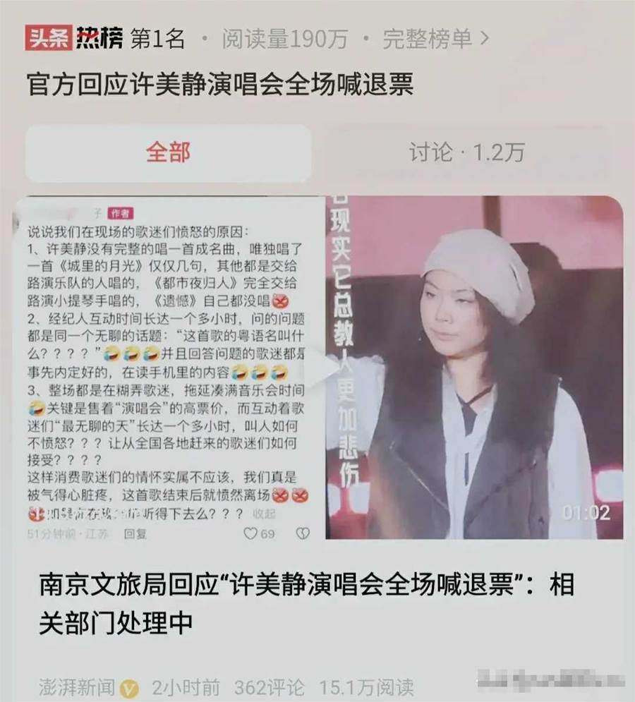 然后,許美靜又才出來,她出來后坐著示意大家安靜聽歌。但是后面的大部分,許美靜都讓台下觀眾唱,自己在上面指揮,然而觀眾不答應了,大家是來聽你唱歌的,你卻大部分都讓觀眾來唱了。這讓現場觀眾很是氣憤,大量觀眾高喊「退票」。