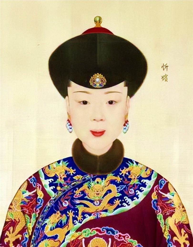 忻嬪,即後來的忻貴妃戴佳氏,康熙成妃的堂曾孫女,她的母親是康熙敬敏皇貴妃的親侄女,此畫像大約是她19歲的相貌。一生為乾隆生下兩位皇女,一個四歲時夭折,另一個十歲時夭折,忻嬪在28歲被封為忻妃,同年臘月懷孕,第二年四月突然去世,按嬪位的標準下葬。