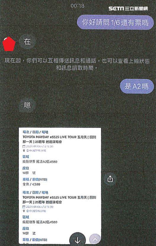 除此之外,2024年1月初,另名從事證券金融業的王姓女子,瀏覽臉書社團時發現有人賣票,王女立刻私訊詢問,暱稱「Mei」的女子表示,目前仍有庫存,並以1張5000元販售,由于詢問十分熱烈,因此買家必須先匯款。