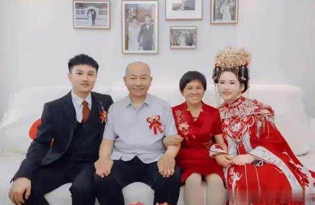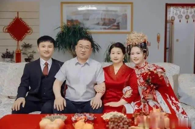 上圖中,新娘子與兩位老人合影,老人們的笑容寬廣,顯示出對這樁婚事的滿意和歡迎。他們的身姿放松,面部表情中充滿了得意和期待。而新娘旁邊的男子,服裝整潔,佩戴著與新娘配套的紅色結婚配飾,顯然是新郎。這一家人的氛圍,無疑透露出這是婆家的合影。