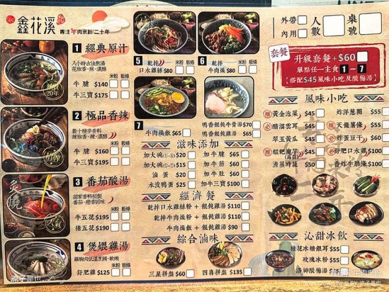 ▼鑫花溪牛肉米粉菜單如下:編號1-4是湯麵;5-6是乾麵;7是牛肉燥飯。加60元升級套餐可任選一個45元風味小吃及酸梅湯。