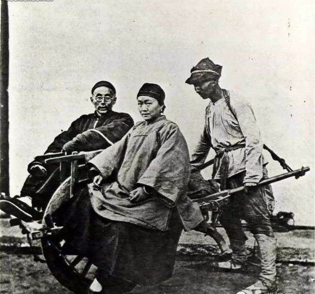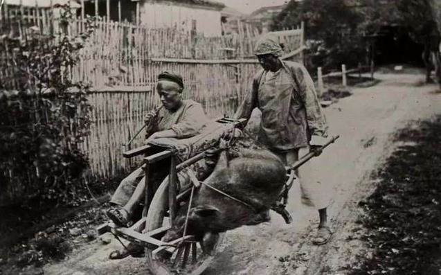 地主老財和地主婆坐在獨輪車上,由幫工推著。