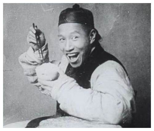 晚清時期,社會動盪,老百姓深陷水深火熱之中,而圖中這位男子,卻露出了大大的笑容,一看便知發自內心,他端著碗,裡面是