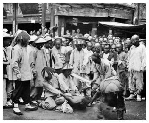 照片裡,犯人被2名男子按在地上,他身體的正上方,是明晃晃的大刀,即使圖片有些模糊,卻仍然可以看出刀刃之鋒利,他們的旁邊,則是無數圍觀百姓,晚清時期,全國各地都有公開行刑的地方,起初,百姓們會害怕,不敢看,但隨著被斬之人越來越多,百姓們也逐漸麻木。