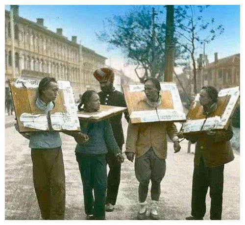 這是一張罕見的彩照,照片中4名中國犯人脖子上戴著枷鎖,手則被手銬連在一起,一字排開,他們的身後,則是一個印度人,當年上海人將他們稱為「紅頭阿三」,他們是英租界從印度調來的「公務員」,專門負責幹雜事,每天拿著警棍,在街上走來走去,惹人厭惡,由于他們信仰錫克教,頭上會纏著紅色頭巾,故而得名「紅頭阿三」。